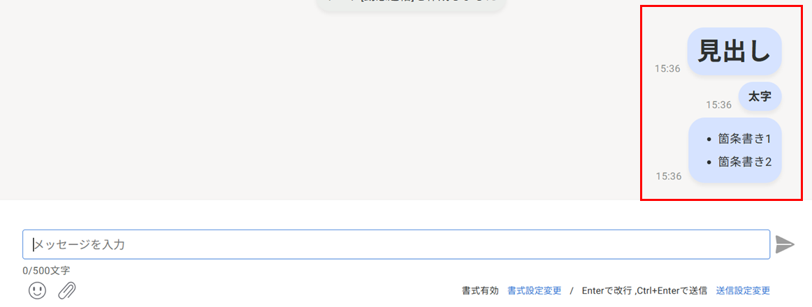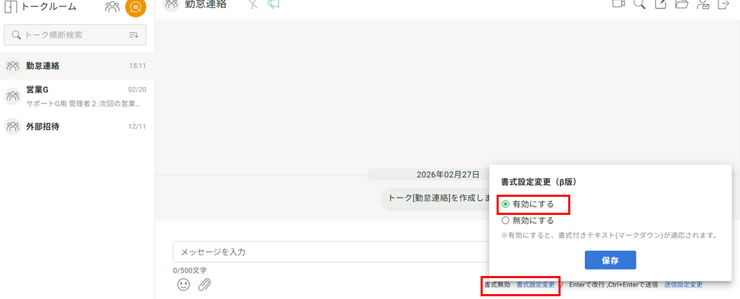 1.トーク画面フッターの右下にある[書式設定変更]から「有効にする」を選択してください。